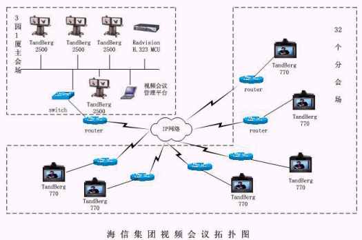 山東海信集團有限公司會議電視項目以海信大廈為中心,覆蓋各個省的35個分支機構。充分利用自己網絡資源的優(yōu)勢,采用ITU(國際電聯(lián))的H。323標準。于-2004-年初經過系統(tǒng)方案的征集、產品的反復測試,最終確定了由華夏科技代理的挪威TANDBERG的視頻終端,并于2004年6月份簽訂了一期采購合同,共計36套視頻終端。
