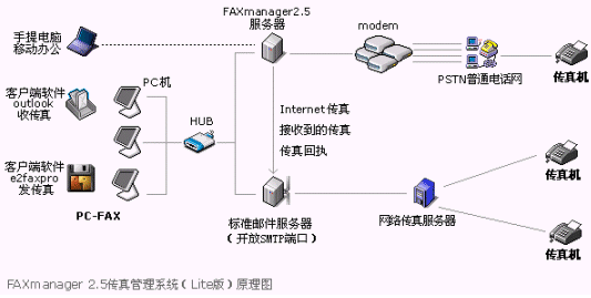 FAXmanager 2.5傳真管理系統(tǒng)安裝在局域網(wǎng)的一臺(tái)專用服務(wù)器上,運(yùn)行環(huán)境可以是:Windows98/NT/2000/XP等,此服務(wù)器可以同郵件服務(wù)器為同一臺(tái)機(jī)器,構(gòu)成企業(yè)郵件/傳真專用服務(wù)器,F(xiàn)AXmanager 2.5可以和企業(yè)郵件系統(tǒng)或群件系統(tǒng)整合使用,可以是Unix/Linux環(huán)境的Qmail和Sendmail等郵件系統(tǒng),也可以是Microsoft Exchange和Lotus Domino/Notes等群件系統(tǒng),當(dāng)然也可以是IComMail等企業(yè)郵件系統(tǒng),也支持虛擬主機(jī)設(shè)置企業(yè)郵局開設(shè)POP3帳戶和上網(wǎng)代理服務(wù)器的使用環(huán)境。