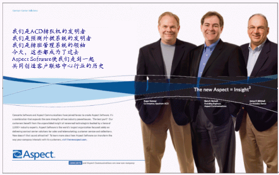 非常感謝您對(duì)科勝通軟件(Aspect Software)中國(guó)公司的支持,經(jīng)過一系列的收購(gòu)與合并,全球呼叫中心呼入技術(shù)的發(fā)明者,全球呼叫中心呼出技術(shù)的發(fā)明者,全球一體化聯(lián)絡(luò)中心系統(tǒng)的締造者,全球勞動(dòng)力管理排班系統(tǒng)的領(lǐng)導(dǎo)者,在世界高新技術(shù)飛速發(fā)展的今天,歷史性的走到了一起,誕生了全新的世界級(jí)呼叫中心的巨輪Aspect