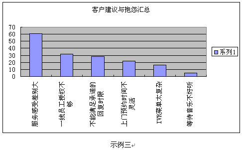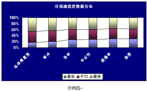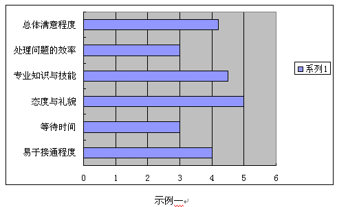 客戶滿意度調查的數據及分析結果應該以一種易讀易解的方式呈現。圖表的形式總是比單純、枯燥的EXCEL表格和長篇大論更容易被人理解并留下深刻印象。常用的圖表形式示例如下: