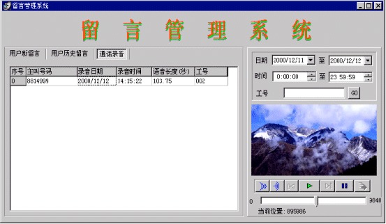 當系統(tǒng)中無話務(wù)員登錄或等待超過20秒,則進入語音信箱服務(wù)。語音信箱在進入時提示用戶:“系統(tǒng)正忙,請留下您的聯(lián)系電話,復本機號請掛機,復其他號碼請輸入電話號碼,按‘#’號鍵結(jié)束,或者在聽到‘嘟’的一聲之后留下你的留言”,當主叫號碼位數(shù)不夠7位時,提示:“系統(tǒng)正忙,請輸入您的聯(lián)系電話,按‘#’號鍵結(jié)束,或者在聽到‘嘟’的一聲之后留下你的留言”,系統(tǒng)將客戶留下的電話號碼記錄到數(shù)據(jù)庫中。將留言存放到一個指定目錄中,用話務(wù)號作為語音文件名。