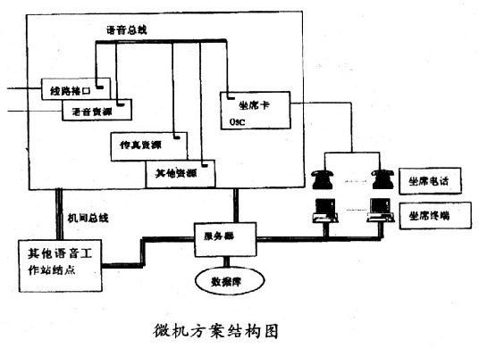 這種方案以近幾年發(fā)展迅速的微機(jī)語(yǔ)音處理技術(shù)為基礎(chǔ),其基本思想是在微機(jī)平臺(tái)上集成各種功能的語(yǔ)音處理卡,完成通信接口、語(yǔ)音處理、傳真處理、坐席轉(zhuǎn)接等功能,再結(jié)合外部的計(jì)算機(jī)網(wǎng)絡(luò)實(shí)現(xiàn)各種應(yīng)用系統(tǒng)的需求。