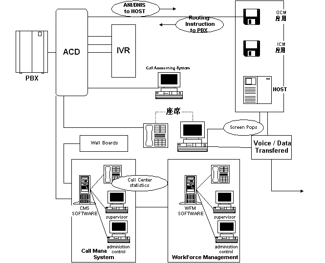 PSTN中繼線路經(jīng)由PBX路由轉(zhuǎn)接到呼叫中心中的個(gè)人電話或其它電話設(shè)備上,即常說(shuō)的交換機(jī)(switch)。領(lǐng)先的交換機(jī)制造商,象朗訊(Lucent)、北電(Nortel)、Aspect和Rockwell,等等,都提供智能化的交換機(jī)硬件,其中最重要的是自動(dòng)呼叫分配功能,自動(dòng)呼叫分配器(ACD)是一種特殊的交換機(jī)(排隊(duì)機(jī)),用來(lái)處理大量密集的話務(wù)并根據(jù)技能優(yōu)先算法和空閑優(yōu)先算法將呼叫智能地轉(zhuǎn)接到合適的座席話務(wù)員。
