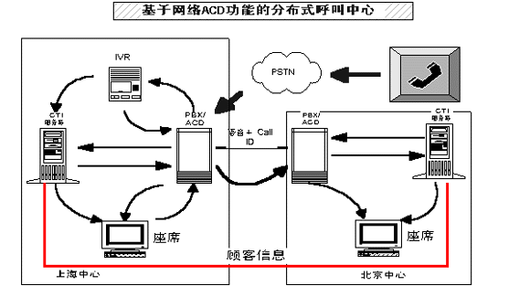 采用智能呼叫分配(ACD),由多種條件決定路由的選擇,如業(yè)務(wù)員的忙閑統(tǒng)計(jì)、業(yè)務(wù)員的服務(wù)能力、每天不同時(shí)段呼叫統(tǒng)計(jì)、主叫用戶(hù)的所在區(qū)域以及主叫用戶(hù)的號(hào)碼等。企業(yè)呼叫中心甚至可突破語(yǔ)言界限,跨越不同電話系統(tǒng)網(wǎng)絡(luò)分布到全球轉(zhuǎn)發(fā)話音及數(shù)據(jù)。