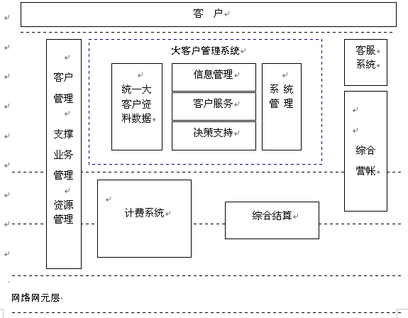 電信大客戶管理系統(tǒng)是在收集大客戶市場(chǎng)調(diào)查信息、大客戶資料信息、大客戶經(jīng)營(yíng)戰(zhàn)略資源的基礎(chǔ)上,自動(dòng)采集專業(yè)計(jì)費(fèi)、綜合營(yíng)帳、客服、網(wǎng)管、財(cái)務(wù)等系統(tǒng)的相關(guān)數(shù)據(jù),實(shí)現(xiàn)快速、全面、準(zhǔn)確的新客戶業(yè)務(wù)受理、新增需求受理及故障處理過(guò)程通道,實(shí)現(xiàn)完善的客戶經(jīng)理管理、代理商管理系統(tǒng),最終實(shí)現(xiàn)完整的大客戶滿意度評(píng)估體系和針對(duì)大客戶的個(gè)性化服務(wù)。建成后的系統(tǒng)從管理、服務(wù)、分析三方面出發(fā)主要應(yīng)具備信息管理、客戶服務(wù)、決策支持功能。