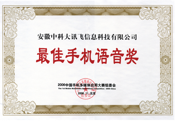 近日,首屆中國手機(jī)多媒體應(yīng)用大賽組委會(huì)將“2006最佳手機(jī)語音獎(jiǎng)”這份沉甸甸的獎(jiǎng)牌和證書授予了科大訊飛。這一由數(shù)十位業(yè)界專家和百萬手機(jī)用戶慎重評選出的獎(jiǎng)項(xiàng),充分說明了科大訊飛在手機(jī)語音應(yīng)用領(lǐng)域的領(lǐng)先地位,其分量不言而喻。