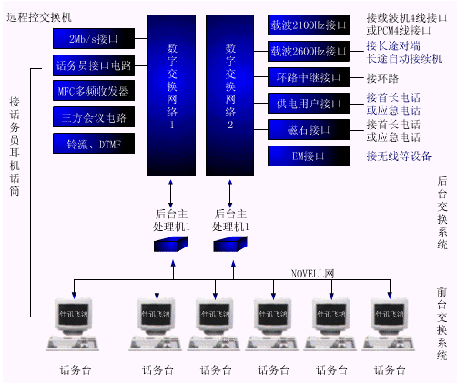 佳訊公司推出的飛鴻9000系列產(chǎn)品是新一代全新智能長途人工話務(wù)系統(tǒng),由"后臺交換系統(tǒng)"與"前臺座席系統(tǒng)"兩部分組成。"后臺交換系統(tǒng)"基于數(shù)字程控交換的原理設(shè)計,運(yùn)用先進(jìn)的數(shù)字化技術(shù),提供豐富的數(shù)字和模擬接口,方便的與現(xiàn)有設(shè)備連接。標(biāo)準(zhǔn)E1數(shù)字中繼可直接與本地程控交換機(jī)相連,省去了PMUX設(shè)備,一改過去模擬系統(tǒng)同數(shù)字程控交換設(shè)備接口困難,轉(zhuǎn)換設(shè)備復(fù)雜的缺點(diǎn)。各類豐富的模擬接口(載波接口、PCM四線接口、共電接口、磁石接口、環(huán)路中繼接口、養(yǎng)路接口、VF接口等)可方便的接入各種模擬設(shè)備。