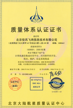 經(jīng)過(guò)近半年時(shí)間的建立和保持質(zhì)量體系運(yùn)行,佳訊飛鴻于在2002年3月順利的通過(guò)為期三天的嚴(yán)格審核,并重點(diǎn)對(duì)佳訊公司核心技術(shù)的CTI平臺(tái)進(jìn)行審核。2002年4月2日通過(guò)了ISO國(guó)際組織的新體系標(biāo)準(zhǔn)ISO9001:2000的體系認(rèn)證,取得了通過(guò)該標(biāo)準(zhǔn)的認(rèn)證證書(shū)。佳訊飛鴻公司也成為國(guó)內(nèi)第一家對(duì)CTI平臺(tái)進(jìn)行審核并通過(guò)認(rèn)證的公司。其完成標(biāo)志著公司從成立之時(shí)起即嚴(yán)格遵循國(guó)際企業(yè)標(biāo)準(zhǔn)及現(xiàn)代企業(yè)管理模式,以軟件產(chǎn)品質(zhì)量管理體系為載體,以客戶(hù)需求為導(dǎo)向。全面提高產(chǎn)品、服務(wù)質(zhì)量,順應(yīng)不斷變化的技術(shù)發(fā)展方向和市場(chǎng)變化,在質(zhì)量、技術(shù)、成本和交期等方面全力滿(mǎn)足客戶(hù)需求,為客戶(hù)提供最佳性?xún)r(jià)比的產(chǎn)品和服務(wù)。
