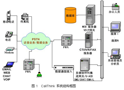 CallThink電視購物呼叫中心系統(tǒng)由以下兩部分組成:   CallThink-M 多媒體呼叫中心平臺(tái)是整個(gè)電視購物呼叫中心系統(tǒng)的基礎(chǔ),它負(fù)責(zé)處理呼入與呼出的各項(xiàng)操作以及各項(xiàng)平臺(tái)功能(包括報(bào)表數(shù)據(jù)、路由分配等)。在CallThink電視購物呼叫中心系統(tǒng)中,呼叫中心平臺(tái)是以交換機(jī)為基礎(chǔ)的,由多個(gè)功能模塊組成,主要保證系統(tǒng)呼叫的可靠性。