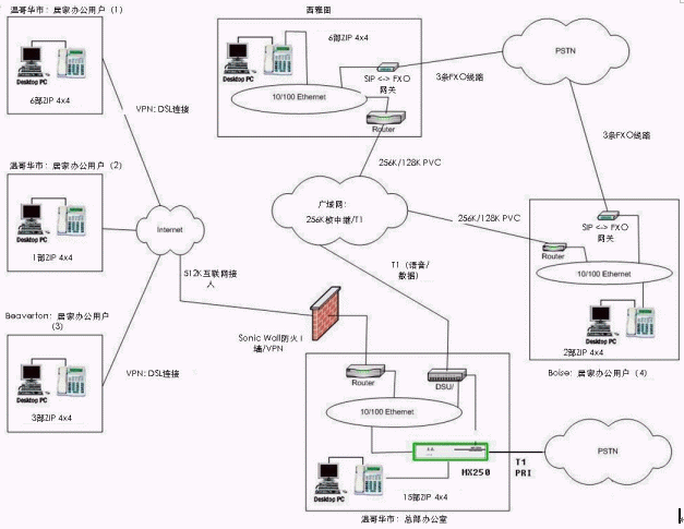 系統(tǒng)的安裝是由蘇迪思科技公司的認(rèn)證增值分銷(xiāo)商Xiologix 來(lái)實(shí)現(xiàn)的。在45分鐘內(nèi)Xiologix 的工程師就設(shè)定和調(diào)試完畢MX250并且完成了第一期20部蘇迪思ZIP4x4 IP電話的安裝。一個(gè)月后Consani Associates公司又進(jìn)行了系統(tǒng)擴(kuò)展追加了30個(gè)用戶(hù)許可和另外30部ZIP4x4 IP電話。Consani Associates 公司采用蘇迪思科技的MX250系統(tǒng)后的公司系統(tǒng)網(wǎng)絡(luò)拓樸圖如下: