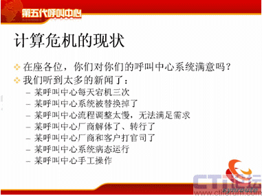 呼叫中心現在已經了比較嚴重的計算危機,我聽到了很多,因為我重點是在搞技術這一行當,我就問一個問題,在座的各位,你們對你們的呼叫系統(tǒng)滿意嗎?我相信大部分人可能嘴上都說比較滿意,但是很多人對深層次的矛盾都非常清楚,為什么不滿意?