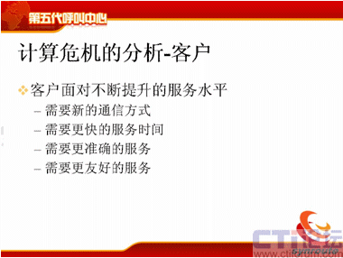 我分析一下計算的危機,計算危機來源于三個方面,第一是客戶面對不斷提升的服務水平,現在需要新的通信方式,包括電話、傳真、短信、電子郵件等等,還包括網上的護航瀏覽,表單共享,電子排版等等通信方式。第二方面需要更快的服務時間,80%的電話是20秒接起,可是短信的響應時間為什么這么長,需要更準確的服務,電話的服務是什么樣的,我現在需要網上交談的服務質量也能夠得到保障等等,這是客戶對IT服務者提供的壓力。