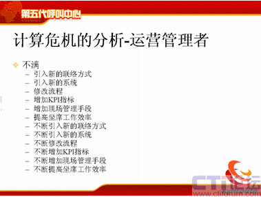 計算危機的下一方面是運營管理者,可能在座很多人是做運營管理的,你們會不斷去跟IT服務者提需求,我下一個月想引進新的聯絡方式,下個月我想引進新的軟件,引進新的流程,我想增加KPI指標,我想增加現場的管理手段,我想提高座席的工作效率,后面也是不斷的,不斷地去引入新的聯絡方式。