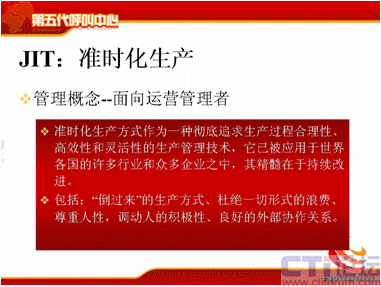 這四個特性是相輔相成的,首先在獨立方面,每一部分都有自己的特點,適應自己企業(yè)發(fā)展的需要,同時也是相互制約的。首先我說這個獨立意識,對于呼叫中心來說,從經營者的角度上,為什么要提TSP的概念呢?我們經常遇到一個企業(yè)建立呼叫中心,是一個客戶服務中心,我們現在要做電話營銷了,那好吧,我們就建一套電話營銷系統(tǒng);這時候我們要做網絡方面的營銷,好了,我們再做一個網絡營銷的呼叫中心,這是經營者現在意識亟待需要提高的。對于運營管理者來說,JIT思想,我剛才說過它是一個核心的,它是一個不斷需要改進流程的,改進去優(yōu)化的,提出各種KPI指標去優(yōu)化的,那么這個過程也是現在目前運營管理者一直比較薄弱的,需要一直提高的部分。
