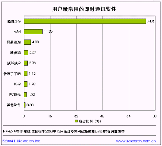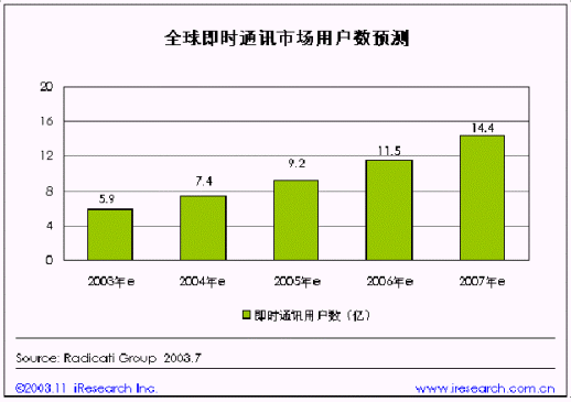 近一、兩年來(lái),即時(shí)通訊軟件(Instant Messenger)的發(fā)展突飛猛進(jìn)。即時(shí)通訊所擁有的實(shí)時(shí)性、跨平臺(tái)性、成本低、效率高等諸多優(yōu)勢(shì),使之成為網(wǎng)民們最喜愛的網(wǎng)絡(luò)溝通方式之一。據(jù)預(yù)測(cè),按照目前的發(fā)展趨勢(shì),到2005 年即時(shí)通訊將成為互聯(lián)網(wǎng)上最普及的交流方式。隨著即時(shí)通訊的普及,全球即時(shí)通訊用戶規(guī)模也在不斷擴(kuò)大。即時(shí)通訊市場(chǎng)龐大的用戶規(guī)模和增長(zhǎng)潛力早已引起了業(yè)內(nèi)巨頭的激烈競(jìng)爭(zhēng)。以美國(guó)為例,目前,AOL、MSN Messenger 和YAHOO 基本上壟斷了整個(gè)美國(guó)IM 市場(chǎng)。