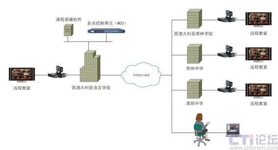 中澳遠(yuǎn)程教育系統(tǒng)采用科達(dá)KDV8000C多點(diǎn)控制單元(MCU)1臺(tái)和課程錄播軟件1套安裝在西澳大利亞語言學(xué)院,4臺(tái)TS6610視頻會(huì)議終端,分別安裝在西澳語言學(xué)院、堪林學(xué)院、常州中學(xué)和淮陰中學(xué)的遠(yuǎn)程教室。此外,考慮到遠(yuǎn)程授課的實(shí)際應(yīng)用需求,系統(tǒng)還提供了無線麥克接入方案。系統(tǒng)部署拓?fù)鋱D見下圖。