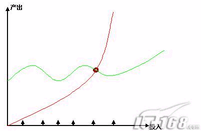 我們可以看到,投入和產出是按月增長的,那么億美目前呢,是(綠線)慢慢增長的一個曲線,隨著投入增加,持續(xù)是一個規(guī)模性的增長。這類似一個2003-2005年,持續(xù)是這樣一個營銷型的穩(wěn)步增長。那么,從2006年開始,這個地方(棕色)的出現(xiàn),開始出現(xiàn)新的變化和新的增長方式,那么我們說這個點叫做拐點。那么傾斜角度和產出就發(fā)生了變化了。那么比如今后發(fā)展到一個階段,新的平臺,新的內容出來后,那么這個拐點也同樣會發(fā)生變化。