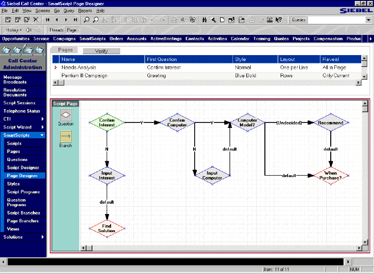 Siebel eMarketing能夠使企業(yè)創(chuàng)建、執(zhí)行、評(píng)估其基于Web的市場(chǎng)營(yíng)銷(xiāo)策略。利用Siebel eMarketing ,市場(chǎng)營(yíng)銷(xiāo)人員可以對(duì)客戶(hù)信息進(jìn)行綜合的分析與預(yù)測(cè),對(duì)市場(chǎng)營(yíng)銷(xiāo)策略和投資回報(bào)預(yù)期進(jìn)行評(píng)估,并且能夠創(chuàng)建圖形化的統(tǒng)計(jì)分析,如圖三所示;能夠自動(dòng)生成基于Web-Email的客戶(hù)交流機(jī)會(huì)并進(jìn)行適當(dāng)?shù)拇黉N(xiāo)行動(dòng)。Siebel eMarketing還可以為客戶(hù)提供人性化的主頁(yè)設(shè)計(jì);進(jìn)行個(gè)性化的Web促銷(xiāo);基于客戶(hù)檔案信息進(jìn)行新產(chǎn)品的直接或交叉推薦;同時(shí)還提供到Siebel eSales的超級(jí)聯(lián)接,當(dāng)客戶(hù)對(duì)某種產(chǎn)品感興趣時(shí),Siebel eMarketing可直接引導(dǎo)其聯(lián)接到Siebel eSales上。另外,企業(yè)營(yíng)銷(xiāo)策略的設(shè)計(jì)者通過(guò)使用Siebel eSmartScript工具可以定制在線(xiàn)的客戶(hù)滿(mǎn)意度調(diào)查,同時(shí)還可以進(jìn)行可視化的營(yíng)銷(xiāo)策略工作流的設(shè)計(jì)。如圖四所示。