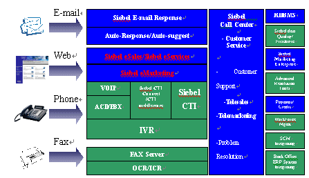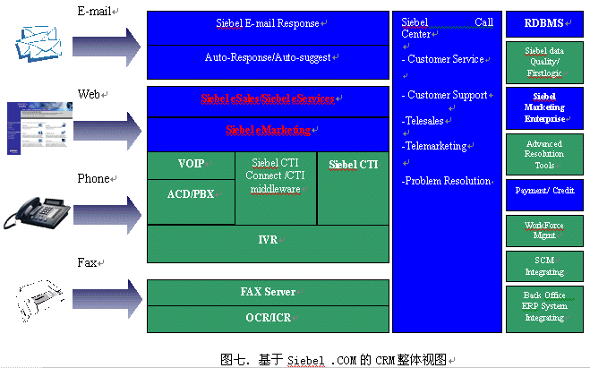 電子商務(wù)網(wǎng)站的運(yùn)作和企業(yè)網(wǎng)站的建設(shè),為其帶來(lái)了更多的市場(chǎng)商機(jī),嶄新的客戶(hù)接觸的機(jī)會(huì)?蛻(hù)在一秒鐘內(nèi)就能決定是選擇你還是別人,可以說(shuō)未來(lái)網(wǎng)戰(zhàn)、傳統(tǒng)企業(yè)的競(jìng)爭(zhēng)就是客戶(hù)關(guān)系的競(jìng)爭(zhēng);網(wǎng)站要生存,企業(yè)要發(fā)展,關(guān)鍵要在發(fā)展客戶(hù)關(guān)系上下功夫。如何涉足CRM領(lǐng)域,如何盡快地利用CRM先進(jìn)的客戶(hù)關(guān)系管理理念,是擺在網(wǎng)站和傳統(tǒng)企業(yè)面前的一個(gè)棘手問(wèn)題。以基于Siebel .COM應(yīng)用為涉足CRM的切入點(diǎn),使企業(yè)能夠更好地實(shí)施電子商務(wù)計(jì)劃,積極發(fā)展基于Web的客戶(hù)關(guān)系管理,最終使網(wǎng)站和企業(yè)真正成為接觸客戶(hù)、了解客戶(hù)、服務(wù)于客戶(hù)的商務(wù)平臺(tái),繼而不斷向完整的企業(yè)級(jí)CRM目標(biāo)邁進(jìn)。圖七展示出完整的基于Siebel .COM的CRM視圖。