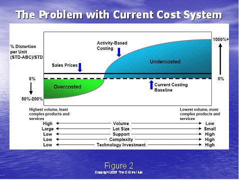 如果該行動與生產(chǎn)產(chǎn)品相聯(lián)系,服務(wù)被用于把成本分配到每一個產(chǎn)品單元上,則一個不同的圖將會出現(xiàn)。綠色陰影下的曲線是正確分配的成本——它是量大最不復(fù)雜的產(chǎn)品的曲線,成本要低得多;藍色陰影上的曲線是量少更復(fù)雜的產(chǎn)品的成本。這種成本分配的方法叫做行動成本計算法,是根據(jù)生產(chǎn)產(chǎn)品和服務(wù)所需的活動量而分配的。目前的成本分配的財務(wù)方法叫標準財務(wù)法,它沒有考慮涉及到生產(chǎn)產(chǎn)品和服務(wù)所需的活動量的“成本驅(qū)動因素”。這個豎軸給出了只使用標準成本分配法時,所造成真實成本失真的數(shù)量。當更多精確的行動成本分配法被使用時,我們可以更清楚地看到什么時候生產(chǎn)某些產(chǎn)品的成本實際上已經(jīng)超過了其銷售價格。我們賣出越多這些無利潤的產(chǎn)品,我們的損失也就越大。