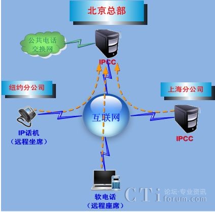客戶采用IPCC-100型的IPCC系統(tǒng)組建一套分布式呼叫中心系統(tǒng)。它不僅實(shí)現(xiàn)呼叫中心功能,又完全取代傳統(tǒng)PBX作為核心的通信系統(tǒng)?蛻艨偛咳萘繛50門分機(jī),30門用于呼叫中心坐席,20門用于辦公線路用。另有2個(gè)分支機(jī)構(gòu)分別配置一臺IX-50和IE-62,作為分公司的電話交換設(shè)備。通過互聯(lián)網(wǎng)與總部的IPCC點(diǎn)對點(diǎn)對接,實(shí)現(xiàn)內(nèi)部互通免費(fèi)。
