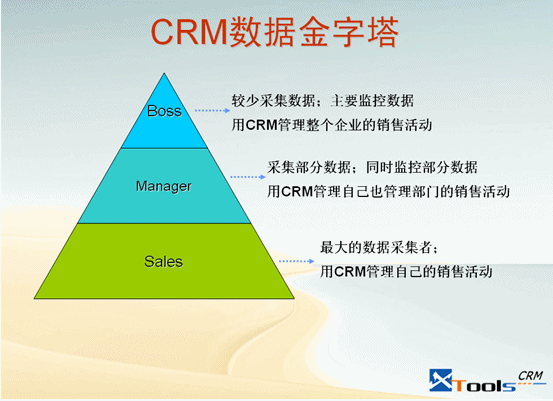 好的銷售管理軟件一定不能是銷售人員的枷鎖和羈絆,只有定位于服務銷售人員的軟件,才會讓弱勢的銷售人員樂于應用。在這里,銷售人員是主角,因為他們在銷售過程中主導數(shù)據(jù)。讓我們來看看銷售管理軟件/CRM軟件中的數(shù)據(jù)金字塔: