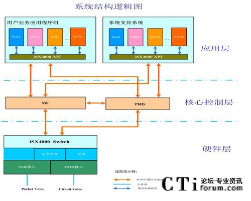 MC是整個(gè)的系統(tǒng)控制核心,其完成對iSX4000 交換機(jī)的所有控制功能,包括系統(tǒng)配置管理、呼叫控制、媒體網(wǎng)關(guān)控制和媒體資源管理等。應(yīng)用層的業(yè)務(wù)應(yīng)用程序發(fā)起的所有控制命令,通過MC路由到指定的iSX4000交換機(jī)上,并由iSX4000交換機(jī)最終完成指定的操作,而操作的結(jié)果最終通過MC,返回給業(yè)務(wù)應(yīng)用程序。同理,由iSX4000交換機(jī)發(fā)起的控制信號,亦是通過MC來派發(fā)給特定的業(yè)務(wù)應(yīng)用程序,業(yè)務(wù)應(yīng)用程序處理后,通過MC反饋給iSX4000交換機(jī)。