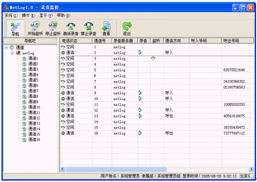 Netlog系統(tǒng)中控制臺(tái)是一個(gè)統(tǒng)一配置和管理的平臺(tái),可以部署在網(wǎng)絡(luò)內(nèi)的任意一臺(tái)主機(jī)上,各個(gè)功能模塊都可以單獨(dú)工作,也可以同時(shí)使用,控制臺(tái)所有模塊可以通過(guò)系統(tǒng)導(dǎo)航(ToolBar)來(lái)引導(dǎo)啟動(dòng)。用戶可以通過(guò)控制臺(tái)操作網(wǎng)絡(luò)上所有記錄服務(wù)、數(shù)據(jù)服務(wù)和文件服務(wù)。控制臺(tái)作為最終用戶終端可以完成用戶的所有操作,設(shè)置每個(gè)服務(wù)器甚至每個(gè)通道的屬性、執(zhí)行各種用戶操作、指定服務(wù)的工作方式、錄音查詢、錄音管理、輸出報(bào)表、排班等。控制臺(tái)根據(jù)用戶權(quán)限的不同限定用戶的操作,更好的保障了系統(tǒng)的運(yùn)行和語(yǔ)音記錄文件的安全。