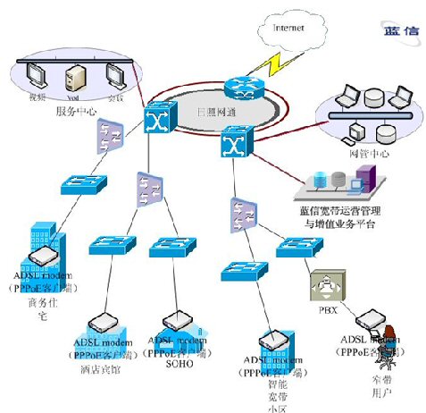 在以以太網(wǎng)技術(shù)為主建設(shè)的運(yùn)營區(qū)域,在中心由一臺模塊化的核心交換機(jī)支持,輔以多臺BASE設(shè)備連接,在接入層用交換機(jī)做接入設(shè)備,保證用戶數(shù)據(jù)的快速傳播。在網(wǎng)絡(luò)核心處,部署信利公司的藍(lán)信寬帶認(rèn)證計費(fèi)系統(tǒng),負(fù)責(zé)對全網(wǎng)用戶的安全認(rèn)證、計費(fèi)及管理。藍(lán)信寬帶認(rèn)證計費(fèi)系統(tǒng)除支持標(biāo)準(zhǔn)的RADIUS協(xié)議外,還支持PPPoE、802.1x認(rèn)證。在用戶終端處,部署藍(lán)信特制的PPPoE客戶端,實(shí)現(xiàn)撥號上網(wǎng)。