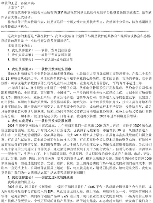 阿里巴巴集團(tuán)資深副總裁、阿里軟件總經(jīng)理王濤先生出席會(huì)議,闡述了“軟件互聯(lián)平臺(tái)”未來發(fā)展模式及“五年規(guī)劃”布局路線圖。中寬網(wǎng)信總經(jīng)理余輝先生作為特邀嘉賓、合作伙伴代表為大會(huì)致辭并發(fā)言。