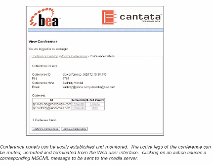 在上述應(yīng)用中,一用戶建立了一個多媒體會議會話。該會議的進行一如我們平常所熟悉的基于運營商的語音會議系統(tǒng)的商務(wù)會議。不同的是,它使用了基于Web的圖形交互, 使得用戶可以建立會議時間以及受邀請的參與人的列表,此外, 該應(yīng)用還發(fā)出了一封含有該會議相關(guān)的聯(lián)絡(luò)信息的電子郵件。并且,它還充分利用了Cantata SnowShore 媒體服務(wù)器的高級多媒體功能為會議參與人提供豐富的多媒體體驗。