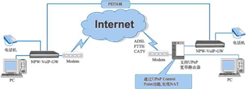 NPW-VoIP-GW作為客戶端VoIP網(wǎng)關(guān)置于各個(gè)企業(yè)分支機(jī)構(gòu)或家庭用戶桌面。其WAN接口可以連接各類同步modem以PPP方式或使用以太網(wǎng)口接入公網(wǎng)。同時(shí)NPW-VoIP-GW上的FXO接口可以連接PBX接入PSTN網(wǎng)絡(luò)實(shí)現(xiàn)備份功能。如圖所示NPW-VoIP-GW上連接的話機(jī)可以直接通過(guò)Internet或PSTN撥打?qū)Ψ健?br />