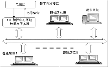 系統(tǒng)由以下部分組成:CTI服務(wù)器、接警席位系統(tǒng)、班長席位系統(tǒng)、局長席位系統(tǒng)。各部分系統(tǒng)可根據(jù)實(shí)際需求任意組合,各個(gè)部分充分考慮到開發(fā)的實(shí)用性、可靠性、先進(jìn)性和開放性,能夠?qū)④浖S護(hù)降到最小程度,這樣的設(shè)計(jì)可以讓用戶能夠改動(dòng)硬件和數(shù)據(jù)庫,卻不用將軟件整體更換,保證了用戶的投資。其結(jié)構(gòu)如圖2所示。