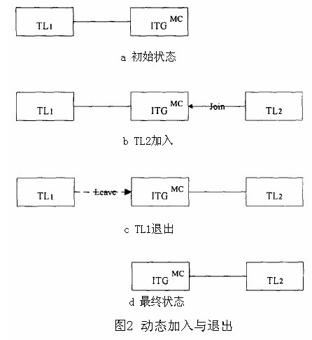 hoc多點(diǎn)會議的動(dòng)態(tài)加入與退出是等價(jià)的。圖3(a)說明了ITG與TL1通信時(shí)的漫游。圖2(b)說明了子網(wǎng)1向子網(wǎng)2的移交處理。圖2(c)說明了在移交處理結(jié)束后ITG與TL1連接的中斷。最后,移交處理成功完成,只剩下ITG與TL2的連接,如圖2(d)所示。