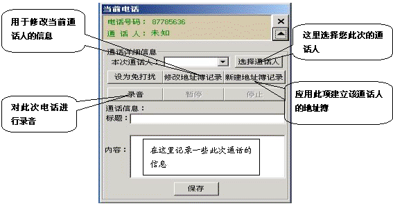 如果有電話打入時(shí),在屏幕的右側(cè)會(huì)彈出一個(gè)對(duì)話框,它顯示了當(dāng)前來電的號(hào)碼和通話人(如果在地址簿中沒有記錄則顯示為未知),點(diǎn)擊彈出全部菜單功能,它相當(dāng)于一個(gè)功能強(qiáng)大的通話記事本,用它既可以邊接聽電話邊整理相關(guān)通話的文字記錄,又可以錄下通話的全部?jī)?nèi)容。如果這個(gè)電話是您不愿接聽的,也可以將它設(shè)置為“免打擾”,這樣,這個(gè)號(hào)碼以后將存入免打擾名單中,若此號(hào)碼再呼入,系統(tǒng)將自動(dòng)掛斷此呼叫。如果這個(gè)電話是您認(rèn)為的重要客戶打過來的,您也可以將此號(hào)碼添加到重要客戶組中,以便您今后接聽或設(shè)置電話轉(zhuǎn)移時(shí)能與其它呼入電話相區(qū)分。