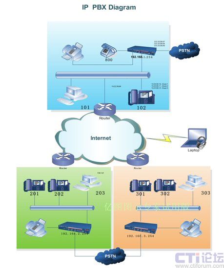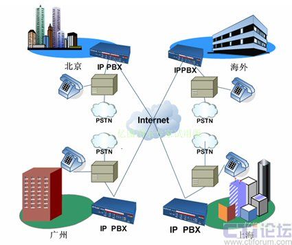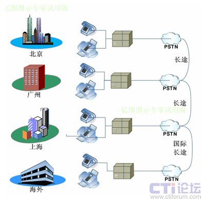 各分支機構(gòu)租用獨立的電話號碼并接入當?shù)豍STN,在這種架構(gòu)下,各地之間通話就會產(chǎn)生長途費用,并占用電話線路,但如果使用IP