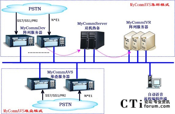 MyCommAVS自動語音系統(tǒng)由MyCommDev設備控制器、MyCommServer核心服務器和MyCommIVR流程解析器三大核心模塊組成。根據不同模塊部署方式,可以建議兩大模式方案: