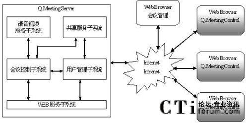 系統(tǒng)選用北京億方連線通訊技術有限公司具有國際先進水平的全新第四代網絡視頻協(xié)作會議中心Q.Meeting為核心進行構建,該系統(tǒng)由會議服務器Q.Meeting Server和基于IE 瀏覽器的客戶端組成。Q.Meeting Server運行于一臺服務器上,構成網絡會議中心,提供會議控制、視頻服務、語音服務、共享服務、WEB服務和會議用戶管理等功能。所有參加會議的人員只需通過IE瀏覽器訪問會議中心網站就可以參加會議,通過訪問會議頁面和嵌于其中的客戶端插件Q.Meeting Control實現音頻和數據共享等交流。