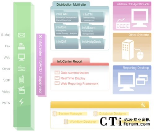 由于今日的客服中心已是多媒體的客服中心,不再只有單純的電話進線,客戶尋求服務的管道更多樣化,InfoCenter Total Solution可以完全整合應用程序、數(shù)據(jù)倉儲系統(tǒng)、多媒體溝通互動管道,藉由不同的系統(tǒng)達到分析與處理客戶需求,并且達到一致性的工作流程管理,提供更高質量的服務。