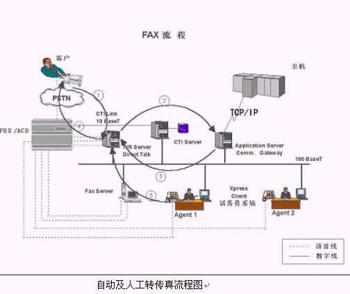 在線傳真(OneCallFAX),客戶用傳真機(jī)打電話到CallCenter,做過一些交易后要求傳真服務(wù),就在傳真機(jī)上按鍵切換到傳真模式,F(xiàn)AX通過同一條線發(fā)回,這種情況是同一通電話的在線傳真服務(wù)。