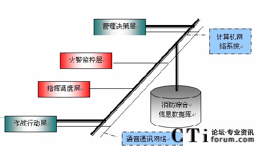 通過對(duì)消防安全監(jiān)控指揮中心業(yè)務(wù)的分析,引進(jìn)先進(jìn)的數(shù)據(jù)通信網(wǎng)絡(luò)和語音通訊網(wǎng)絡(luò),我們可以將未來的消防業(yè)務(wù)層次抽象地概括為四層(如圖所示):管理決策層、火警監(jiān)測(cè)層、指揮調(diào)度層和作戰(zhàn)行動(dòng)層。與管理決策層對(duì)應(yīng)的組織機(jī)構(gòu)為消防通信指揮中心;與火警檢測(cè)層、指揮調(diào)度層對(duì)應(yīng)包括消防指揮中心的接處警子系統(tǒng)、指揮調(diào)度等子系統(tǒng);與作戰(zhàn)行動(dòng)層對(duì)應(yīng)的組織機(jī)構(gòu)為消防站(消防隊(duì))和消防車及消防隊(duì)員。