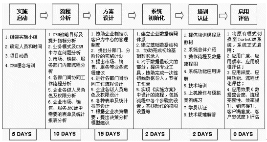 根據(jù)東風(fēng)設(shè)備廠作為傳統(tǒng)國營制造企業(yè)的特點,TurboCRM的實施顧問將系統(tǒng)實施分為實施啟動(理念導(dǎo)入)、流程分析(業(yè)務(wù)梳理)、方案設(shè)計(流程固化)、系統(tǒng)初始化(系統(tǒng)部署)、培訓(xùn)認(rèn)證、啟用評估六個階段,步步推進(jìn)。
