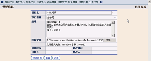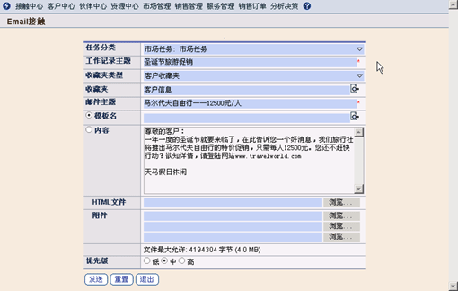 電子郵件接觸方式可以方便企業(yè)在極短的時(shí)間內(nèi)為大量的客戶(hù)發(fā)布各種信息,比如:企業(yè)需要為客戶(hù)提供的促銷(xiāo)信息、服務(wù)通告,或者節(jié)日問(wèn)候等。TurboCRM系統(tǒng)可以將郵件模板與選取的客戶(hù)資料進(jìn)行自動(dòng)匹配,瞬間即可將信息發(fā)送給大量客戶(hù)。