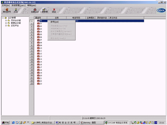 用戶接入:系統(tǒng)啟動(dòng)后,如果用戶電話呼入,則系統(tǒng)自動(dòng)接聽(tīng),并提請(qǐng)用戶輸入密碼校驗(yàn)后進(jìn)入會(huì)議系統(tǒng)。也可'集體撥號(hào)'、'單個(gè)撥號(hào)''點(diǎn)名'