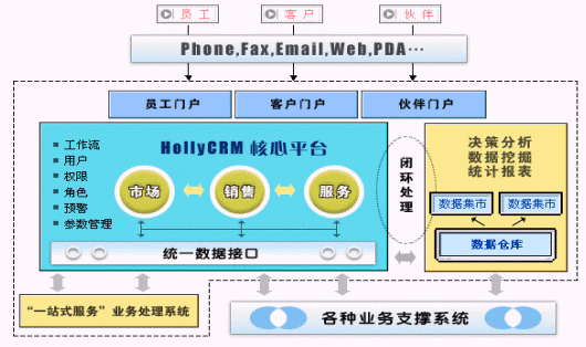更關(guān)鍵是,HOLLYCRM(合力金橋軟件)的CRM不是單純的、簡單的客戶管理產(chǎn)品,它是一套完整的解決方案,覆蓋了協(xié)作型、運(yùn)營型和分析型的全部范疇,其結(jié)構(gòu)框架見圖,其核心平臺涉及到市場、銷售、服務(wù)等多個(gè)環(huán)節(jié),并通過數(shù)據(jù)集市或者數(shù)據(jù)倉庫的形式,提供數(shù)據(jù)挖掘、決策分析等服務(wù)。最關(guān)鍵的是,HOLLYCRM(合力金橋軟件)在提供解決方案外,還不斷提升管理和咨詢能力,和一些咨詢公司合作,將咨詢和產(chǎn)品作為一個(gè)整合的方案提供給用戶,并提供360度的系統(tǒng)咨詢、設(shè)計(jì)和實(shí)施、維護(hù)服務(wù)。