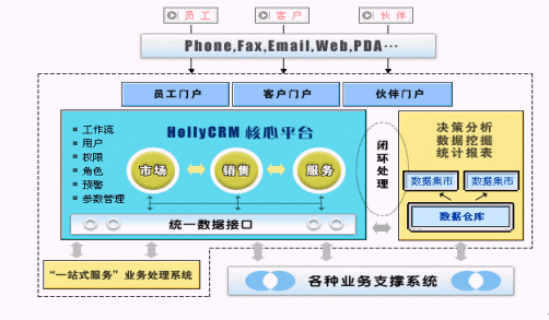 HollyCRM通過EAI與企業(yè)原有的業(yè)務(wù)系統(tǒng)充分整合,有效解決了阻礙企業(yè)內(nèi)部信息良性流轉(zhuǎn)的"信息孤島"現(xiàn)象。HollyCRM將分析型CRM產(chǎn)生的客戶價值和經(jīng)營分析結(jié)果實時反饋到運營型CRM中,通過協(xié)作型CRM提供的接觸渠道,針對不同客戶提供個性化的營銷、銷售和服務(wù)活動。HollyCRM實現(xiàn)了整個企業(yè)信息的閉環(huán)、良性循環(huán)。