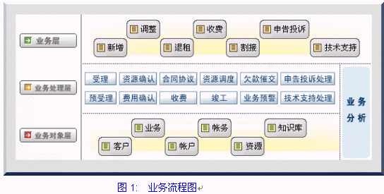 網(wǎng)通一站服務業(yè)務系統(tǒng):實現(xiàn)業(yè)務受理、資源確認、費用確認、合同/協(xié)議、收費、資源調(diào)度、竣工、業(yè)務預警、申告投訴處理、技術支持處理功能。其業(yè)務流程如下圖:
