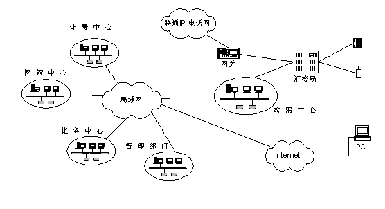 聯(lián)通北京分公司將客戶服務(wù)系統(tǒng)與現(xiàn)有計(jì)費(fèi)、營業(yè)、帳務(wù)系統(tǒng)進(jìn)行組織,形成了一個有機(jī)的結(jié)合體,能夠充分發(fā)揮出現(xiàn)有系統(tǒng)的優(yōu)勢?蛻舴⻊(wù)系統(tǒng)從營業(yè)帳務(wù)系統(tǒng)提取相關(guān)用戶資料,建立客戶服務(wù)的系統(tǒng)資料庫,從計(jì)費(fèi)系統(tǒng)提取相關(guān)用戶話費(fèi)資料等供查詢使用。同時客服系統(tǒng)還將與北京聯(lián)通現(xiàn)有的計(jì)費(fèi)、營業(yè)、帳務(wù)、網(wǎng)管等相關(guān)系統(tǒng)以及Internet相連,提供業(yè)務(wù)處理和用戶自助服務(wù)等業(yè)務(wù)。本客服中心通過2對路由器和DDN專線與聯(lián)通北京分公司現(xiàn)有的局域網(wǎng)(包括管理部門、網(wǎng)管中心、計(jì)費(fèi)中心、帳務(wù)中心等相關(guān)系統(tǒng))連接,并通過該局域網(wǎng)訪問Internet。