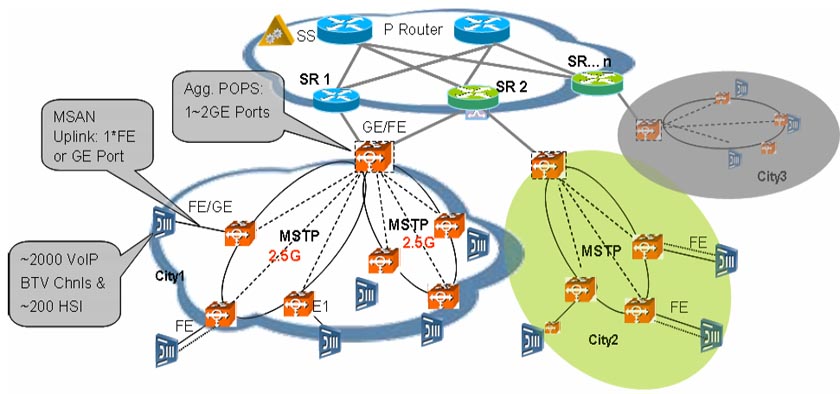 MSAN已經(jīng)逐漸成為基于IP架構(gòu)的下一代電信網(wǎng)建網(wǎng)的主要接入方式,近幾年越來越多的固網(wǎng)運營商普遍采用綜合接入(MSAN)建網(wǎng)模式,如英國的最大固網(wǎng)運營商英國電信的21CN網(wǎng)絡(luò),中國的最大固網(wǎng)運營商中國電信、中國網(wǎng)通,巴西的最大固網(wǎng)運營商Telemar等。而MSTP單一平臺具備支持MSAN接入的所有業(yè)務(wù)的承載要求,且成本最低。華為公司MSTP設(shè)備具有強大的數(shù)據(jù)接入?yún)R聚及傳送特性,并通過Metro