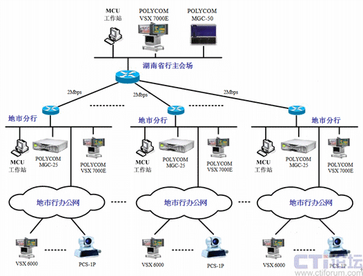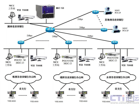 在株洲、邵陽(yáng)和永州市行采用級(jí)聯(lián)的方式來(lái)實(shí)現(xiàn)。具體實(shí)現(xiàn)方式為:VSX 7000E則和地市行的MGC-25通訊,并且MGC-25負(fù)責(zé)其縣支行終端的接入,同時(shí)用MGC-50和MGC-25的端口級(jí)聯(lián),采用這種連接方式就可以實(shí)現(xiàn)從省行-地市行-縣支行的三級(jí)網(wǎng)視頻會(huì)議的召開。